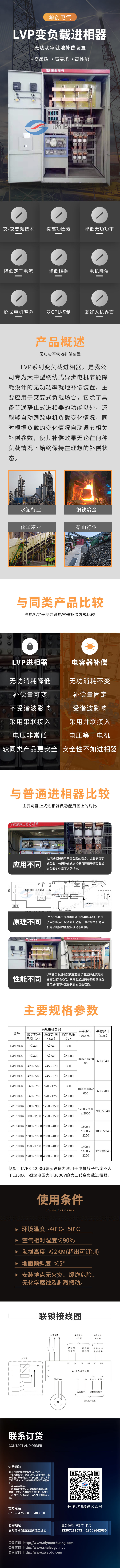 • LVP系列變負載進相器,是我公司專為大中型繞線式異步電機節(jié)能降耗設計的無功功率就地補償裝置,主要應用于突變式負載場合,它除了具備普通靜止式進相器的功能以外,還能夠自動跟蹤電機負載變化情況,同時根據(jù)負載的變化情況自動調節(jié)相關補償參數(shù),使其補償效果無論在何種負載情況下始終保持在理想的補償狀態(tài)。