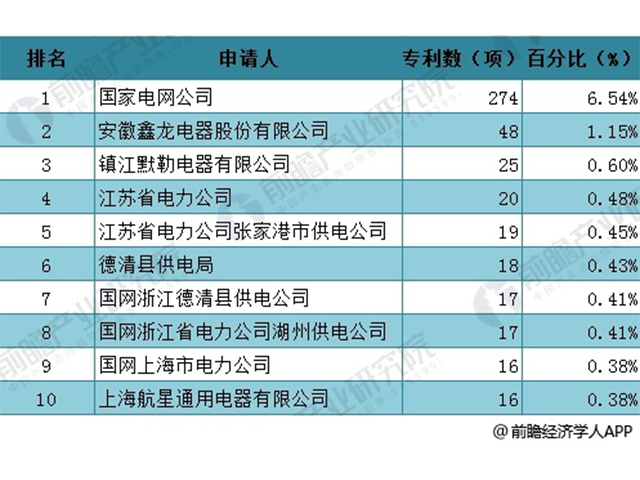 在專利技術(shù)申請人排名前十中,國家電網(wǎng)公司一家獨大,截至2018年5月底,申請專利達(dá)到274項,占全國申請專利的6.54%;排在第二的安徽鑫龍電器股份有限公司專利申請量只有48項,占比為1.15%;其他公司申請專利量不到30項。
