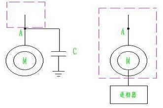 從圖中可以看出:進相器無功補償進相器和電容補償對電機的作用點不同,電容是在電機的前端定子側(cè)進行補償;進相器是從電機的末端轉(zhuǎn)子側(cè)進行補償。