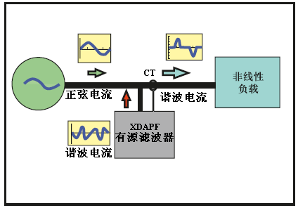 XDAPF通過(guò)外部CT測(cè)量負(fù)載電流或電網(wǎng)電流送到信號(hào)板進(jìn)行處理,控制板完成負(fù)荷諧波電流的計(jì)算和諧波電流補(bǔ)償?shù)拈]環(huán)控制,并產(chǎn)生PWM驅(qū)動(dòng)信號(hào)到驅(qū)動(dòng)板,驅(qū)動(dòng)板驅(qū)動(dòng)逆變器的IGBT從而將所需的補(bǔ)償電流輸出到電網(wǎng),完成諧波濾除的功能。