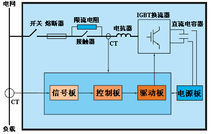 直流電容器為儲(chǔ)能元件并通過(guò)IGBT逆變器和接口電抗器電網(wǎng)輸出補(bǔ)償電流;直流電容同時(shí)通過(guò)電源板為信號(hào)板、控制板和驅(qū)動(dòng)板提供工作電源。