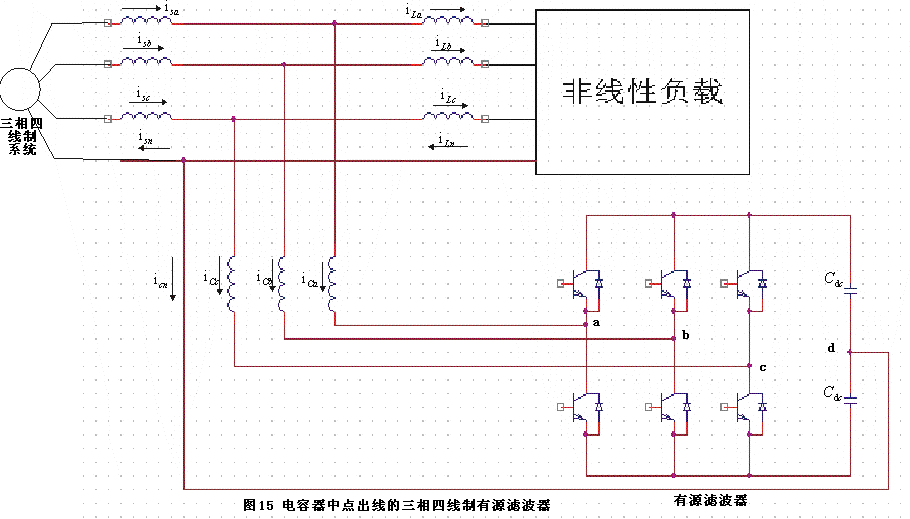 我國380V系統(tǒng)均為三相四線制系統(tǒng),而負荷通常也為三相四線制即存在中線,因而三相電流之和通常不為零即存在零序電流,零序電流中既可能存在零序基波分量也可能存在零序諧波分量,此時采用并聯(lián)型三相三線制主電路的電力濾波器無法消除線路中的零序基波電流和諧波電流以及中線中的電流。在許多情況下,為了保持三相電流的平衡,在大型辦公樓中通常會在三相中合理分配負荷,使三相電流盡量平衡。但是由于單相負荷如計算機、工作站等信息設(shè)備的大量使用,以及大量設(shè)備是后來增加的,因此實際中要合理的分配三相負荷是很難做到的。所以在許多大型的辦公樓出現(xiàn)了三相電流嚴重不平衡,中線電流很大。并聯(lián)型三相四線制有源電力濾波器就是解決這種非線性不平衡問題和諧波問題的有力手段,圖15所示為目前常見的三相四線制結(jié)構(gòu)的并聯(lián)型有源電力濾波器。直流電容中線點與系統(tǒng)中線相連,全部的中線電流都流經(jīng)直流側(cè)的
