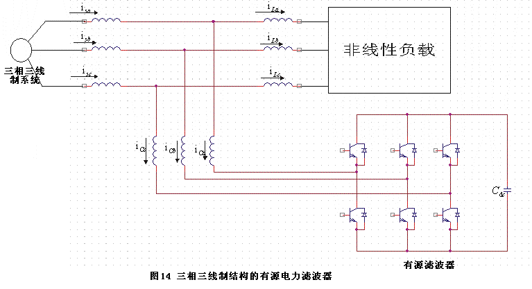 接線,因此針對此類負荷的有源電力濾波器也只需采用三相三線制主電路即可。目前大量功率開關(guān)模塊都已經(jīng)讓三相三橋臂結(jié)構(gòu)制作,因此實現(xiàn)三相三線制主電路結(jié)構(gòu)非常方便。圖14所示為三相三線制結(jié)構(gòu)的有源電力濾波器。