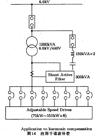 圖16所示為一個(gè)辦公樓系統(tǒng),安裝了一個(gè)容量為300KVA的有源電力濾波器,用來補(bǔ)償八臺(tái)自調(diào)速