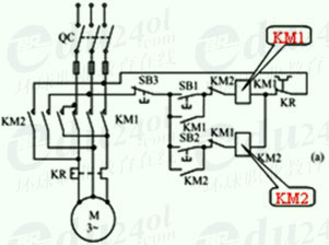 電動機(jī)便反轉(zhuǎn)。同時,串接在正轉(zhuǎn)控制電路中的常閉觸頭KM2斷開,起聯(lián)鎖保護(hù)作用。