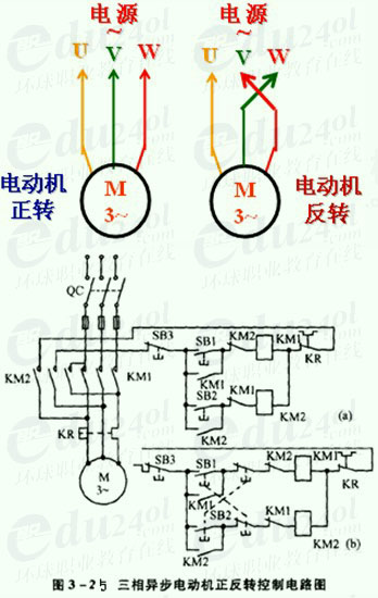 三相異步電動機(jī)的正、反轉(zhuǎn)方法:任意調(diào)換電源的兩根進(jìn)線,電動機(jī)反轉(zhuǎn)。