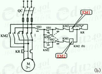 在圖(b)中,當(dāng)電動機(jī)正轉(zhuǎn)時,按下反轉(zhuǎn)起動按鈕SB2,它的常閉觸頭斷開,使正轉(zhuǎn)接觸器線圈KM1斷電,主觸頭KM1斷開。與此同時,串接在反轉(zhuǎn)控制電路中的常閉觸頭KM1恢復(fù)閉合,反轉(zhuǎn)接觸器線圈KM2通電并自鎖,